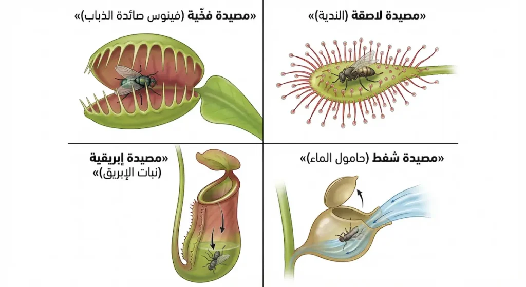 - المصائد الفخية (Snap Traps): تستخدمها فينوس صائدة الذباب (Venus Flytrap – Dionaea muscipula). تنغلق في أقل من 100 مللي ثانية عندما تلمس الحشرة شعيرتين حسيتين خلال 20 ثانية.
