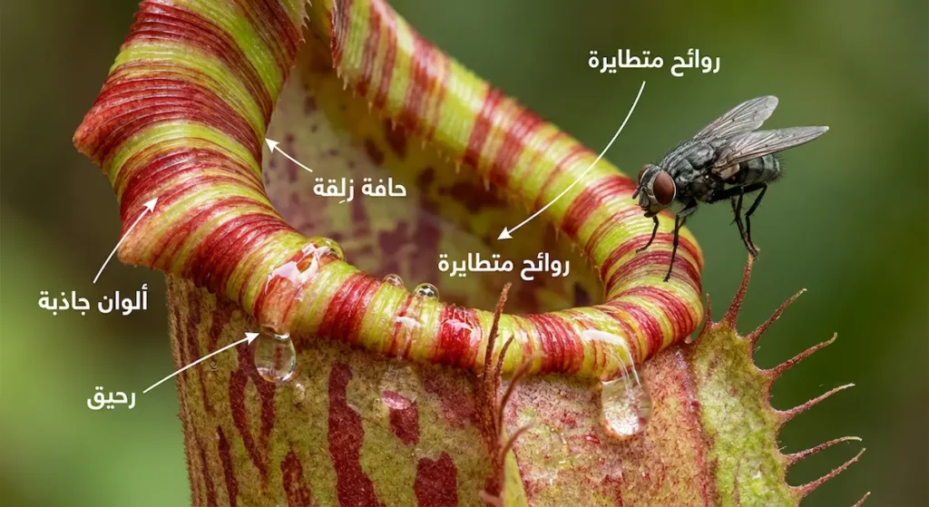 - مصائد الإبريق (Pitfall Traps): تمتلكها نباتات الإبريق (Nepenthes وSarracenia). تنزلق الحشرة على الجدران الملساء وتسقط في بركة من السائل الهاضم.