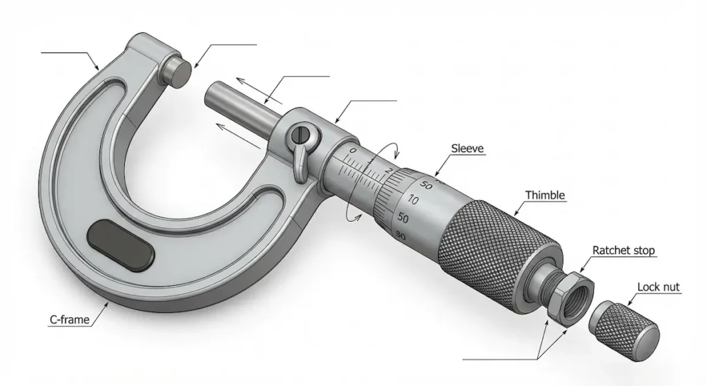 الإطار (Frame): الهيكل الخارجي المعدني على شكل حرف C أو U. يُصنع عادةً من الفولاذ المُقسّى أو الحديد الزهر المطلي لمقاومة التآكل. يوفر الصلابة اللازمة لثبات القياس. بعض الإطارات مغلفة بطبقة عازلة للحرارة لمنع تأثير حرارة اليد على دقة القياس.