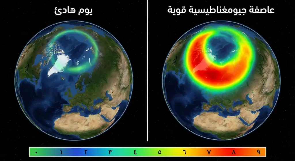 تُقاس شدة العواصف الجيومغناطيسية بمؤشر Kp الذي يتراوح من 0 إلى 9. المؤشر من 0 إلى 3 يعني ظروفاً هادئة. من 4 إلى 5 تظهر عواصف معتدلة مع شفق أكثر نشاطاً. من 6 إلى 7 العواصف قوية والشفق يظهر في خطوط عرض أدنى. المؤشر 8 أو 9 يعني عاصفة شديدة قد تجعل الشفق مرئياً في المناطق المعتدلة.