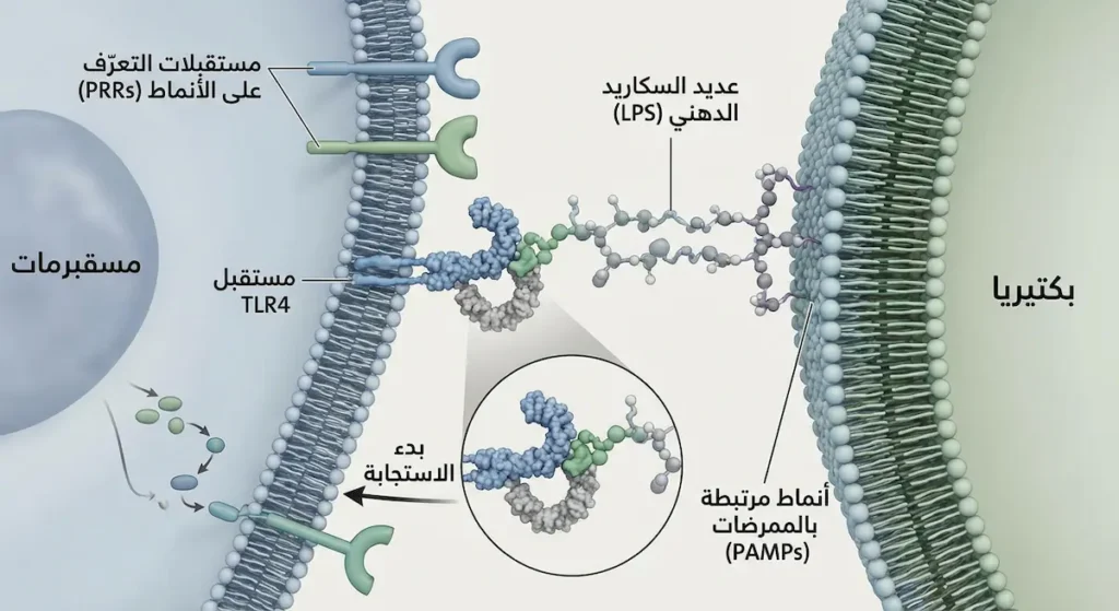 تمتلك الخلايا البلعمية على سطحها مستقبلات التعرف على الأنماط (Pattern Recognition Receptors – PRRs). هذه المستقبلات لا تتعرف على ميكروب بعينه؛ بل تتعرف على أنماط جزيئية مشتركة بين مجموعات واسعة من الكائنات الدقيقة. هذه الأنماط تسمى الأنماط الجزيئية المرتبطة بالممرضات (Pathogen-Associated Molecular Patterns – PAMPs). مثال على ذلك: جدار البكتيريا يحتوي على جزيء يسمى عديد السكاريد الدهني (Lipopolysaccharide – LPS) لا يوجد في خلايا الإنسان. حين تستشعر المستقبلات هذا الجزيء، تعرف فوراً أن ثمة غازياً بكتيرياً.
