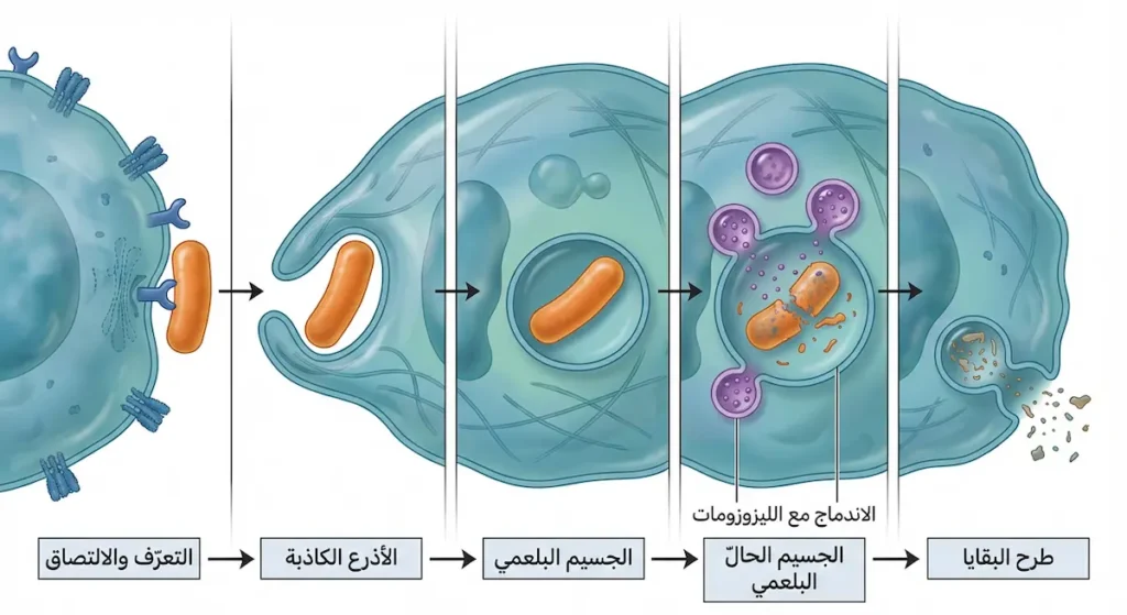 هذا السيناريو اليومي يوضح جوهر عمل الخلايا البلعمية. العملية تسمى البلعمة (Phagocytosis)، وهي كلمة يونانية تعني حرفياً “الأكل الخلوي”. تمر هذه العملية بمراحل متتابعة ومنظمة بدقة مذهلة. أولاً، تتعرف الخلية على العدو عبر مستقبلات خاصة على سطحها. ثانياً، تمد أذرعاً كاذبة (Pseudopodia) تحيط بالهدف. ثالثاً، تبتلعه داخل فجوة تسمى الجسيم البلعمي (Phagosome). رابعاً، يندمج هذا الجسيم مع الليزوزومات (Lysosomes) المليئة بالإنزيمات الهاضمة. وأخيراً، تُطرح البقايا خارج الخلية. كل هذا يحدث في دقائق معدودة.