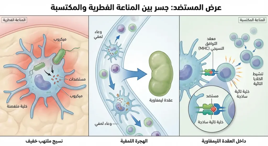 إنفوجرافيك طبي يشرح “عرض المستضد” بواسطة الخلية المتغصنة كجسر بين المناعة الفطرية والمكتسبة، في 3 مشاهد متتابعة من اليسار إلى اليمين: